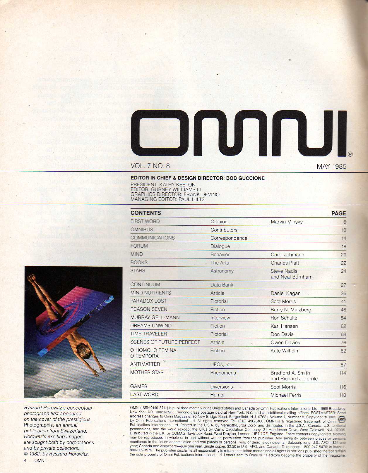 Barry Malzberg Reason Seven. Karl Hansen Dreams Unwind. Kate Wilhem O Homo. Scot Morris Impossible Objects 4. Index by Author Index by Topics Omni Cartoons Memorable Omni Ads Main Index